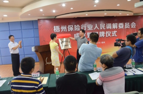 9月13日上午10时,梧州保险行业人民调解委员会在梧州日报办公楼13楼新闻发布会议室举行成立大会暨揭牌仪式。梧州保险行业人民调解委员会的正式成立,标志着梧州市化解保险纠纷的第三方调解机制正式启动,它最大限度地维护保险双方的合法权益,为创建平安梧州,维护社会和谐稳定具有十分重大的意义。