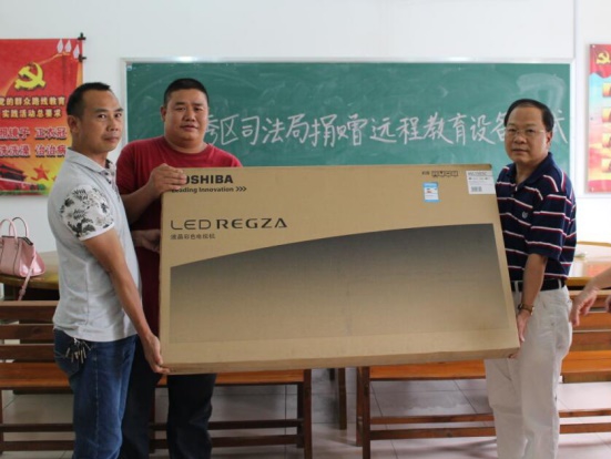 万秀区司法局局长魏钊生向新民村高书记和龚主任转交液晶电视机