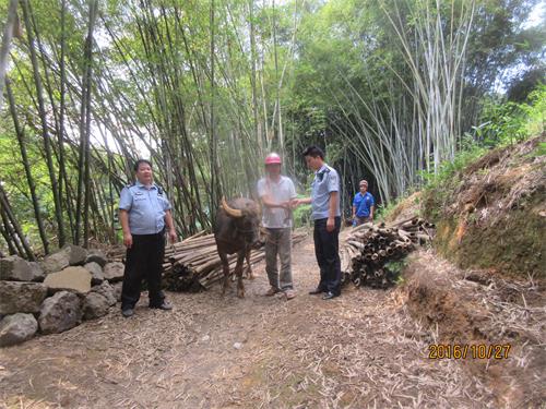 通过各社区群中群众提供的线索,民警巡线追踪,功夫不负有心人,10月27日值班民警在白坭村附近竹林里成功寻回朱某某走失的耕牛。