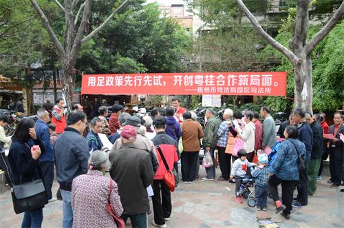 为宣传粤桂合作特别试验区的建设成就和发展动态,引导广大社区居民关心支持试验区建设。11月9日上午,梧州市司法局园区司法所在新兴菜市开展普法活动,主题是:“用足政策先行先试,开创粤桂合作新局面”。