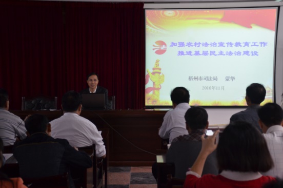 在培训班开班当日,市司法局党组书记、局长蒙华以“加强农村法治宣传教育工作,推进基层民主法治建设”为题,从我国法治建设形势、当前农村法治教育现状、提高农村基层干部法治水平和能力等三个方面进行讲解,辅以贴近生活的案例和生动易懂的语言,为大家带来一节精彩纷呈的法治宣传教育讲座。学员们普遍反映:这样“接地气”的授课方式,更具吸引力和感染力,也更容易吸收和理解。