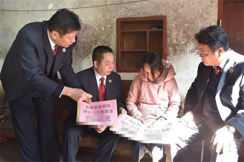 这感人的一幕发生在2016年11月29 日的广西梧州市苍梧县沙头镇大寨村刑事被害人林某的家中。广西自治区检察院党组副书记、副检察长刘继胜还关切地询问林某身体情况、家庭情况,勉励其重振生活信心,今后好好生活。随后,广西自治区检察院党组副书记、副检察长刘继胜、梧州市检察院检察长黄昱、苍梧县检察院检察长金兆军分别将国家司法救助金发放给林某,林某激动得热泪盈眶,向检察机关送上了一面写有“人民检察为人民,三级救助解民忧”的锦旗表示感谢。