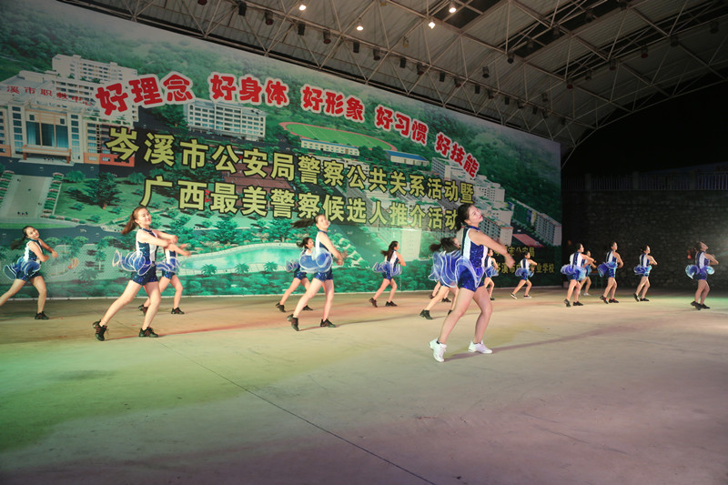 岑溪市公安局民警卢健和协警李茵主持了文艺晚会。岑溪市公安局特巡警大队民警、协警首先进行的整齐划一、威武有力的擒敌拳表演,拉开了晚会的帷幕。随后,民警和学校师生表演的舞蹈《天山那片云彩》、独唱《我想有个家》、《中国警察》、《祝你平安》、舞蹈《就现在》、独唱《等待》、《说句心里话》把晚会一步步推向了高潮,最后晚会在舞蹈《放飞你的梦想》表演中落下了帷幕,每一个节目都赢得了在校师生热烈的掌声。晚会还穿插进行了安全感满意度测评知识、广西第二届“最美警察”候选人投票知识有奖问答,主持人现场向学生提问有关安全感满意度测评及第二届广西“最美警察”候选人投票的知识,然后由学生进行现场作答,答对的奖励一件学习用品等小礼物,引得全场学生热情高涨,纷纷抢答,进一步丰富了晚会的内容。