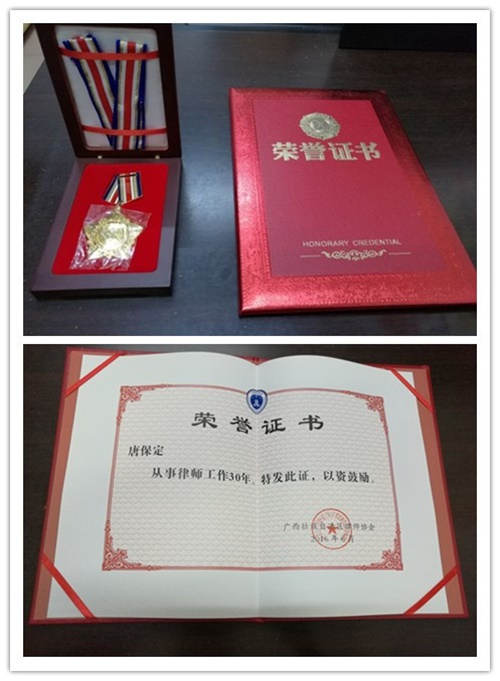 大会上,还特别为34名律师颁发“广西执业30年律师”荣誉证书。自从1979年律师制度恢复的30多年来,他们亲历了律师制度和改革、发展和逐步完善的全过程,大会感谢他们三十年来对广西律师事务发展的执着努力和所做出的贡献。梧州市广西桂江律师事务所覃耀坚、广西通途律师事务所唐保定、广西公力律师事务所莫涛、广西东中律师事务所刘荣进获此殊荣。