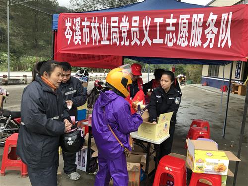 岑溪市林业局党员义工热情地为广大返乡人员送上热茶热水、面包等物品
