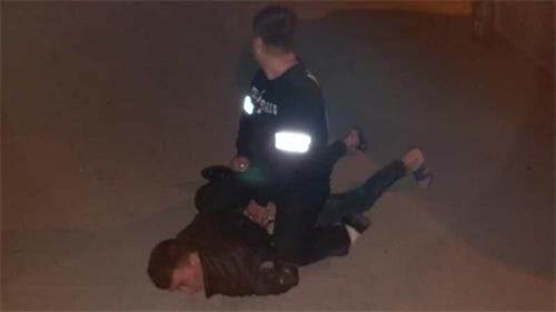 经过半个小时的伏击,当犯罪嫌疑人回到汽车玻璃维修店内取车准备离开时,伏击民警冲了上去,见到突然出现的警察,两名嫌疑人分头逃窜,民警迅速追击,嫌疑人在民警靠近的时候开始激烈反抗,不断用手脚踢打民警,企图挣脱控制,抓捕民警死死将嫌疑人按倒在地,经过十多分钟的搏斗最终制服两名犯罪嫌疑人。在抓捕犯罪嫌疑人时,犯罪嫌疑人顽抗拒捕,造成城北派出所民警赖景杨在搏斗中负伤。