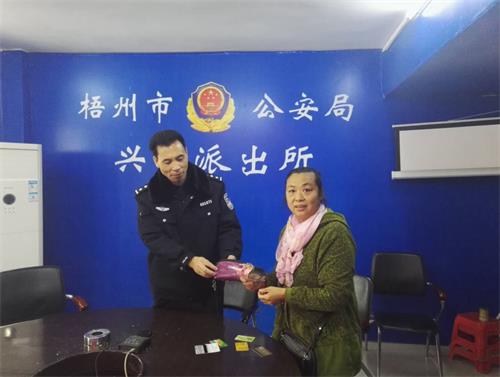 2月4日,某酒店工作人员将一个捡到的紫色钱包送到兴龙派出所,并告知民警,这个钱包是一位粗心女事主在酒店喝茶时落下的,钱包里有若干现金和一些卡件,民警通过户籍信息联系上失主,拿着失而复得的钱包失主感动不已。