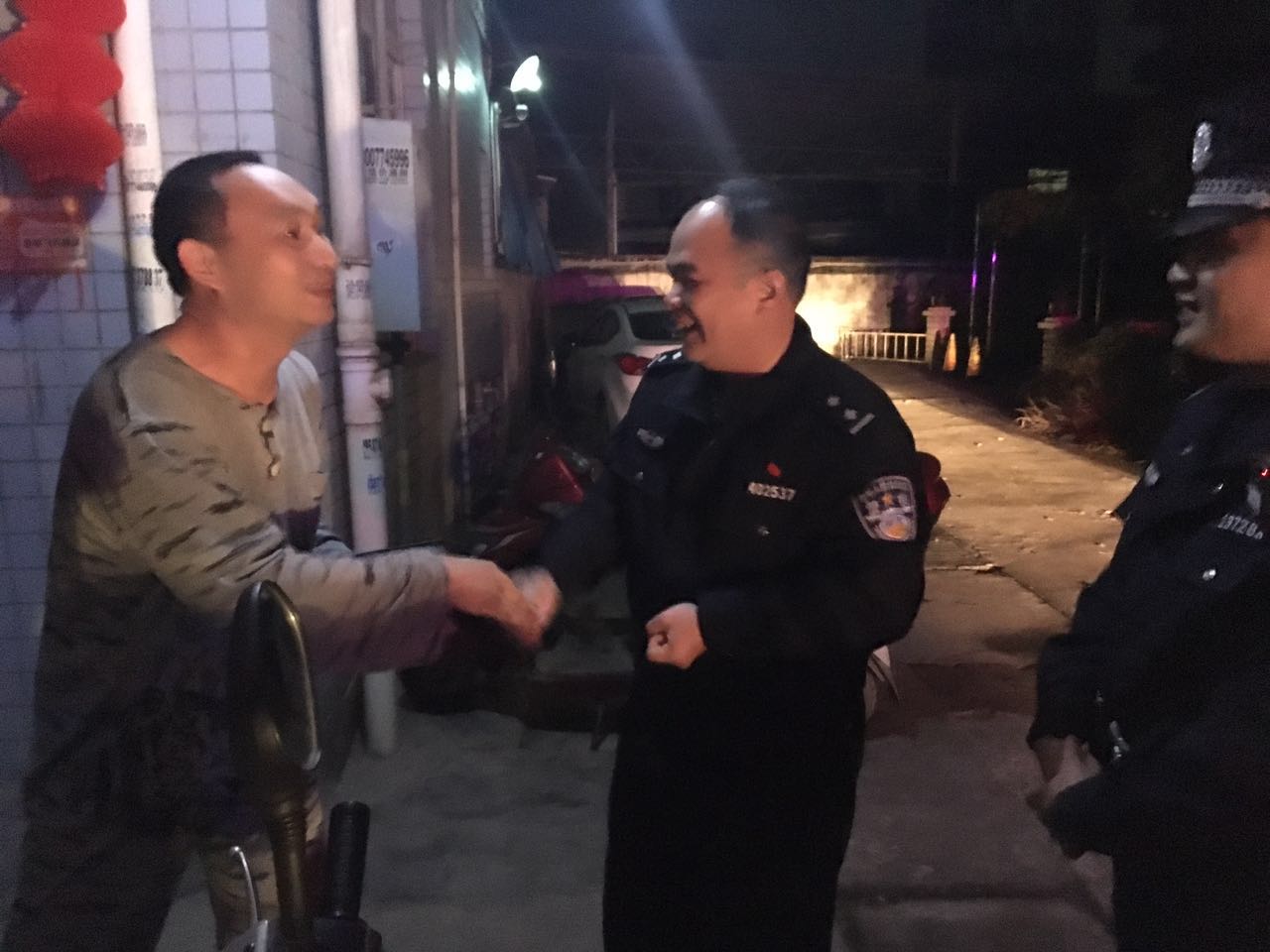 失主找回钱包后与民警握手表示感谢