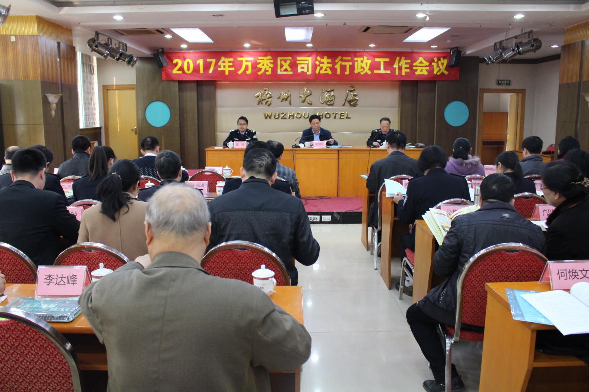会上,传达学习2017年全区政法工作会议、全区司法行政工作暨党风廉政建设和反腐败工作会议、全市政法工作会议以及中共广西壮族自治区第十一届纪律检查委员会第二次全体会议、中共梧州市第十三届纪律检查委员会第二次全体会议精神等会议精神,总结2016年万秀区司法行政工作,研究部署2017年司法行政工作。