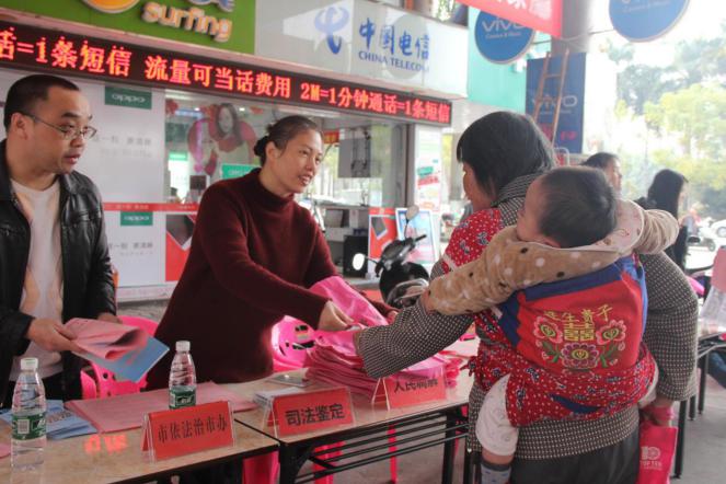 工作人员向经过的妇女发放宣传资料并且认真解答她们提出的法律问题