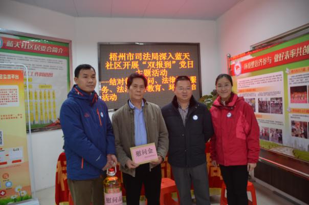 随后,市律师协会党总支宣传委员陈建平律师、广西通途律师事务所党员律师钟火生代表市律协党总支,向党总支结对帮扶的蓝天社区林某一家送上了慰问金和生活慰问品,并关心他们在工作、生活上的情况,鼓励他们克服困难,坚定生活信心。此外,梧州市优秀青年服务团的邱俊山、梁竣庭、冯丽滢、练靖华、杨丽凤、卢远乐、梁理宁、黎居秀、吴承钟律师组成法律服务队,以设点的形式在社区为居民群众提供法律咨询服务和开展法治宣传,解答与社区居民生产生活息息相关的婚姻财产、继承赡养纠纷等法律问题,提供法律意见,引导群众合法维护权益。