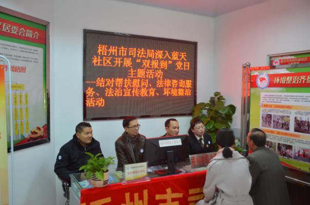 3月10日下午,我市首个法治社区——蓝天社区公共服务中心里人头攒动,到处都活跃着社区群众来访和咨询的身影。梧州市律师协会党总支、市优秀青年律师服务团临时党支部积极响应落实市委、市委组织部关于开展“党员活动日”的号召,组织了12名党员律师走进蓝天社区举办“党员活动日”活动。