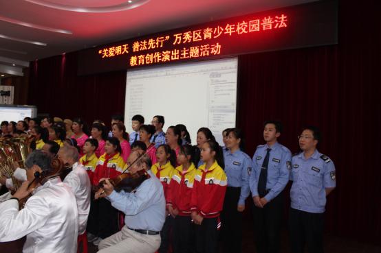 为进一步推动 “关爱明天、普法先行”教育活动的开展,探讨未成年人法治教育的新方法、新形式,加强未成年人思想道德建设,促进未成年人不断增强尊法、学法、懂法、守法的自觉性,2017年3月13日下午,万秀区司法局联合万秀区教育局、万秀区关工委、万秀区团委组织在第一实验小学阶梯教室开展了“关爱明天 普法先行”万秀区青少年校园普法教育创作演出主题活动。