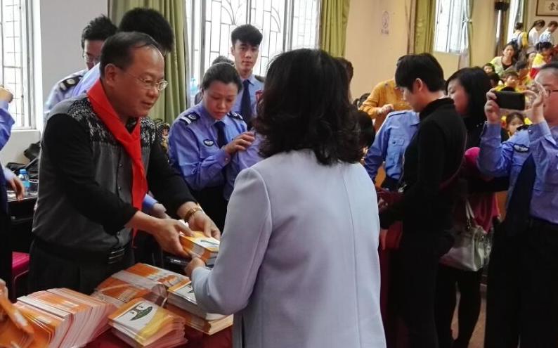 图为万秀区司法局局长魏钊生同志为学校代表派发法治宣传读本