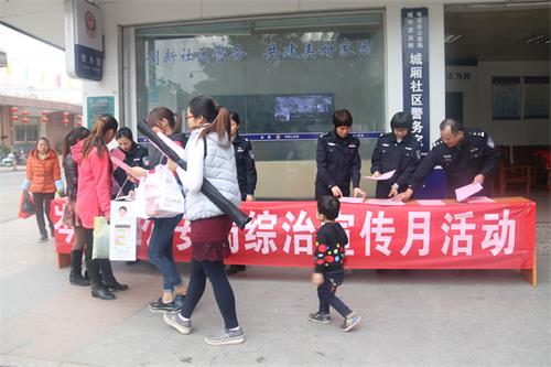 3月15日下午,岑溪市公安局组织宣传、刑侦、经侦、治安、禁毒、出入境大队等警种民警、协警到岑溪市城厢警务站门前开展综治宣传月活动,通过设立咨询台、发放宣传资料、现场解答等形式,积极向广大群众宣传群众安全感满意度调查测评电话及公安机关在打击各类违法犯罪活动、维护社会治安稳定、为民服务等方面工作取得的显著成效以及相关的法律法规和安全防范知识。