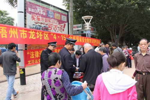 2017年4月14日,龙圩区公安分局联合城区政法委在龙圩镇世纪广场组织开展了“4.15全民国家安全教育日”宣传活动,龙圩区公安分局积极组织民警参与。