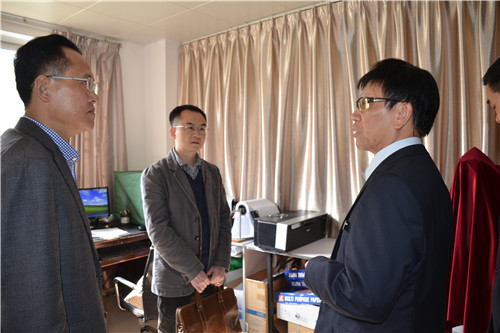 覃副局长(中)认真听取桂林市正诚司法鉴定中心鉴定人(左一)介绍设备仪器