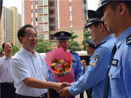 慰问中,朱学庆市长首先向在抓捕中因公受伤的刘勇所长送上鲜花,与值班民警一一握手,并致以节日的问候。随后,朱学庆市长关切的询问了刘勇同志的伤情以及在抓捕中英勇负伤的经过,高度赞赏刘勇所长带伤仍坚守节日安保工作一线的精神。朱学庆市长勉励,广大民警要继续发扬奉献精神,奋勇争先,严厉打击各类违法犯罪行为,进一步提升反恐防恐意识,提高思想站位,推动提升应急处突能力水平,不断提升群众的安全感和满意度,确保我市社会治安大局稳定,人民安居乐业。