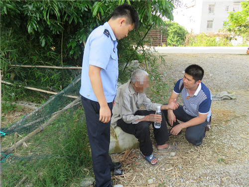 派出所所长带队迅速驱车到达现场,在志成村十字路口往和平街方向约一百米处,看到一名老人瘫坐在路边。由于路上过往车辆较多,老人所在的位置比较靠外,十分危险,民警随即挽扶老人到安全处,并为老人送上矿泉水。