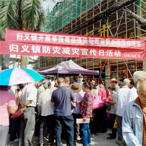 2017年5月17日,岑溪市司法局归义司法所参加了由归义镇政府组织的 “举报毒品违法犯罪奖励办法宣传活动”和“归义镇防灾减灾宣传日”活动。参加本次活动的有镇综治办、归义派出所等十多家单位。各部门为前来咨询的群众一一作解答,并通过发放宣传资料等形式,对防范诈骗、防毒品侵蚀、用电安全、食品安全、防溺水事故等等相关知识进行宣传,切实提高了广大群众的防灾、减灾意识。