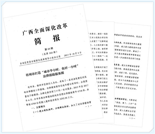 近日,广西改革办《广西全面深化改革简报》第60期(总第165期)《梧州市打造“城市半小时、农村一小时”法律援助服务圈》信息,对我市积极做好法律援助服务的经验做法进行宣传推广。