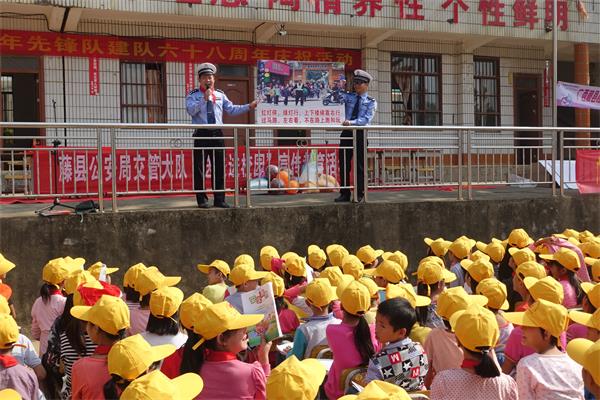 为进一步推进校园安全和"平安藤县"建设,确保全县近二十万中小学生的出行安全,最大限度地预防和减少中小学生交通事故的发生。从今年秋学期开始,藤县公安局交警大队会同藤县桂林村镇银行,深入全县17个乡镇公路沿线中小学开展三万件“小黄帽”免费进校园宣传教育活动,以此提高在校师生的交通安全意识和自我保护能力。图为10月25日上午,民警在金鸡镇旺国小学为师生上交通安全课。