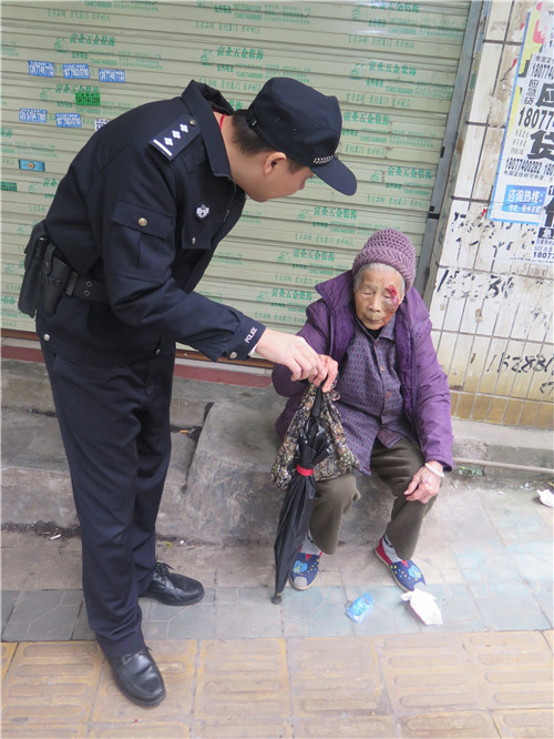 11月23日11时左右,东兴派出所民警从龙骨冲出警返回派出所的途中,途经龙骨路对出路段时,看到前方不远处的路上有人聚集,民警迅速将车靠边停下,发现是一位年迈老人摔倒在路边的人行道上,当时的气温较低,下着小雨,老人在寒风中冻得瑟瑟发抖。经仔细观察,老人的脸部和眼部受伤比较严重,泪水混合着血水顺着老人的脸不停地滴下,因年事已高,老人怎么也坐不起来,只能躺在地上不停地呻吟。民警顾不上老人满身的污迹和血水,毫不犹豫地将老人扶起来,马上通知120医护中心医生前来救治,并向附近群众借来棉衣和端来热水让老人暖身。