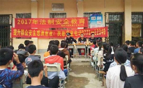 青少年是祖国的未来、民族的希望,而且他们正处于长身体、长知识的重要时期,各方面都很不成熟。为了提高青少年自觉守法意识和自我保护意识,从源头上预防和杜绝青少年违法犯罪案件的发生,必须加强对青少年的法制教育,促进他们的健康成长。因此,龙圩区公安分局新地派出所民警在2017年11月13日上午来到新地二中,为学生们送去了一堂生动有趣的法制课。