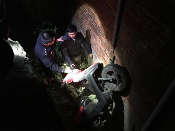 民警到达现场后发现一名男子连人带车摔进接近3米的深沟里,男子被摩托车压住无法动弹,意识模糊。目测男子情况危急,带班领导李林不顾个人安危,迅速到达沟底,与民警合力移开摩托车。