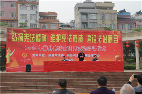 3月28日,由藤县政法委、藤县司法局、藤县普法办联合主办的2018年藤县宪法宣传月活动启动仪式在藤州文化广场举行,拉开为期一个月的宪法宣传月活动序幕。县政法委副书记黄达光、县司法局局长祝继宏、副局长吴志忠出席活动。