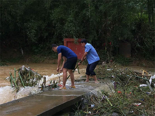 期间,第一书记黄文杰和驻村工作队员江健全组织村委干部,分头行动,覆盖式地深入村里27个村民小组,重点对村民住房,河流水坝,电线杆和滑坡山体有可能存在安全隐患点一一排查。东掛坪组内桥是村民日常出行的要到,风雨侵袭后桥下水面湍急,且桥面已被杂物堵塞,影响通行,两位检察干警马上进行紧急处理,徒手清理被风雨刮落的树枝和各种杂物,以保障通行。