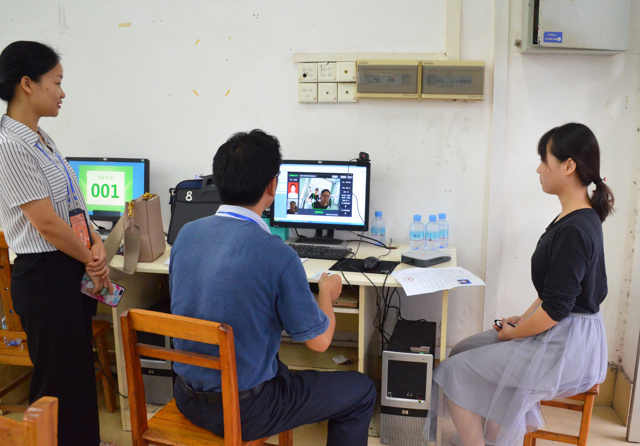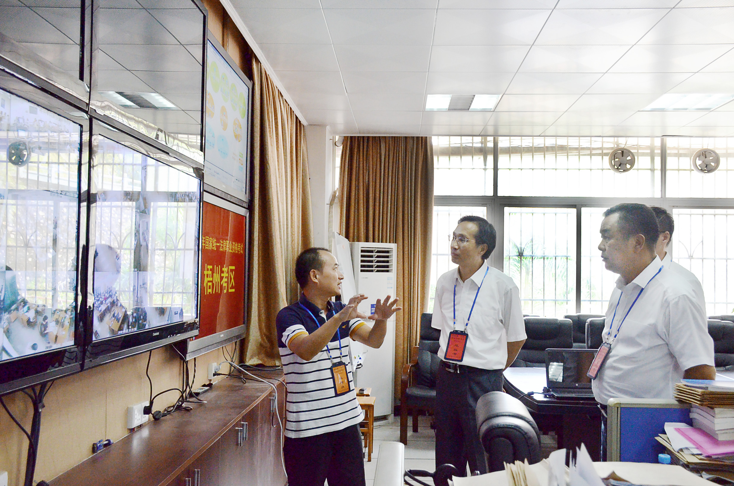 自治区司法厅党委委员、副厅长仇祖和(右一)了解考场监控情况