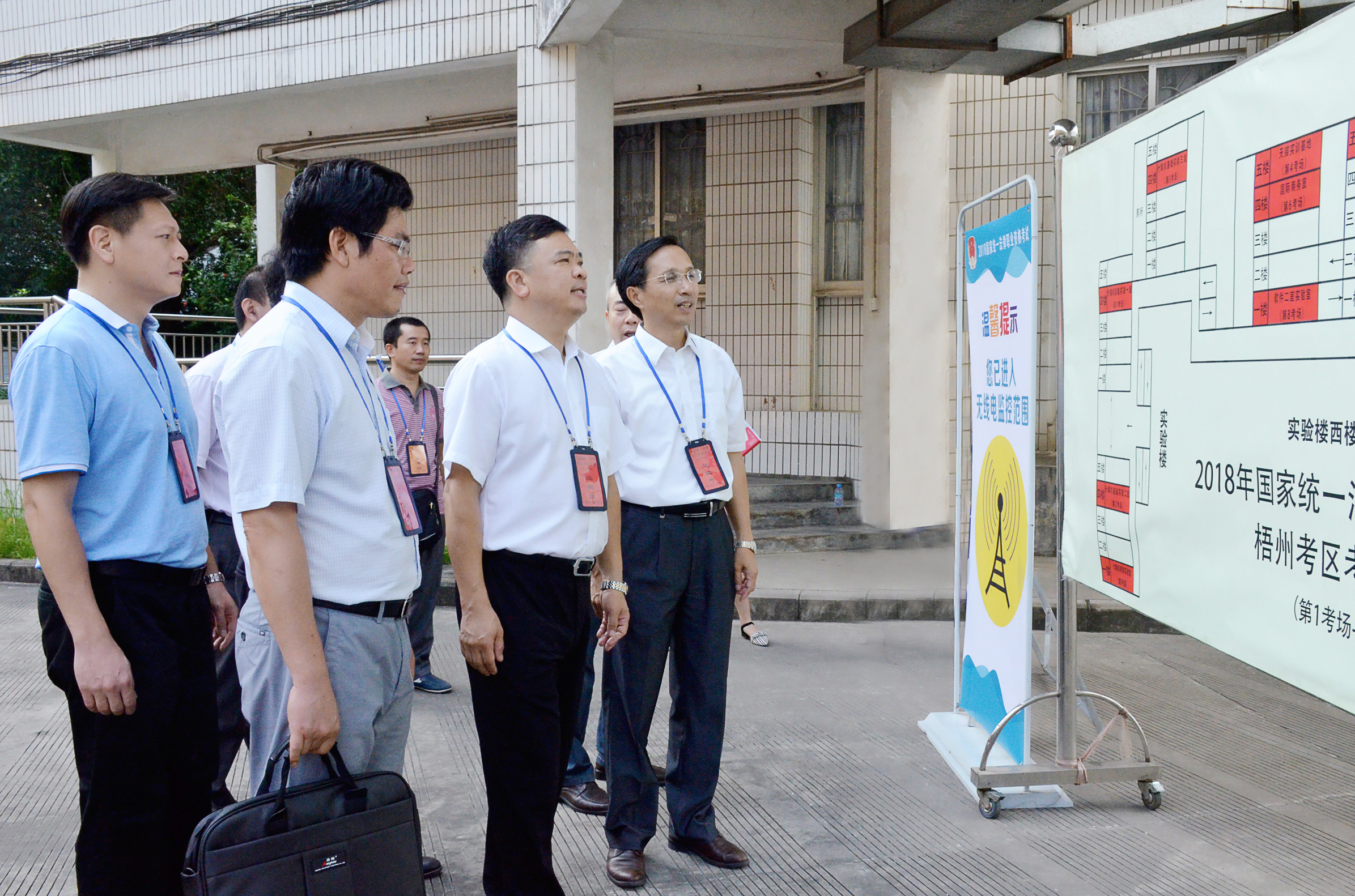 梧州市委常委、政法委书记文建中(左三)查看考场分布