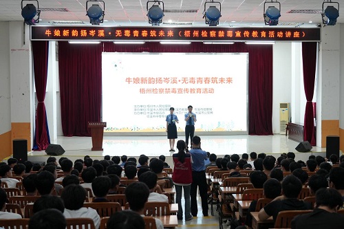 在“6·26”国际禁毒日来临之际,为进一步防范青少年滥用涉麻精药品等成瘾性物质,筑牢青少年识毒、防毒、拒毒的“防火墙”,6月18日上午,梧州市检察机关联合岑溪市禁毒办、公安局、教育局、烟草局、文广体旅局共同走进岑溪市中等专业学校,以群众喜闻乐见的方式开展了一场别开生面的“牛娘新韵扬岑溪 无毒青春筑未来”主题禁毒宣传活动,为该校600余名师生带来一堂生动的禁毒法治教育课。
