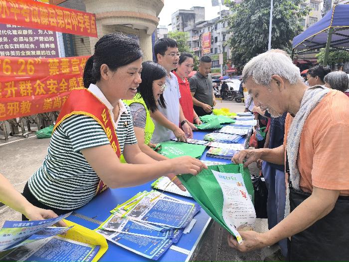 为进一步提升群众对邪教本质的认识,提高其自觉抵御邪教侵蚀的能力,倡导追求文明、崇尚科学的良好风气,6月24日,第38个国际禁毒日来临之际,梧州市藤县金鸡镇组织平安法治办、禁毒办、镇禁毒志愿者协会、司法所等单位结合“6.26”国际禁毒日开展反邪教宣传活动。