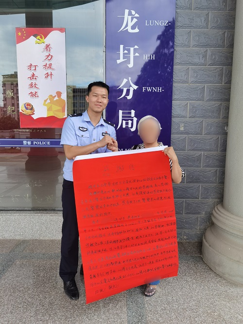 “我深刻真切感受到了我们人民警察的责任与担当,感受到了人民警察全心全意为人民服务的深刻践行。”8月20日,群众曾奶奶带着一封亲手书写的大幅感谢信,交到龙圩公安分局反诈中心民警手中。感谢信字里行间满是对民警的感激,也书写下新时代警民鱼水情深的动人篇章。