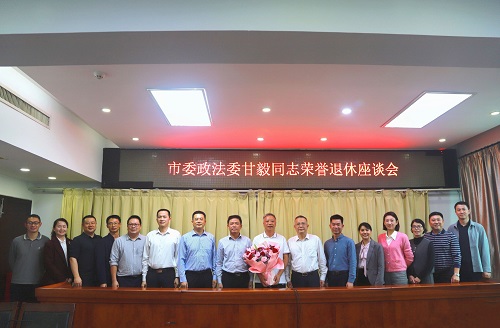 受市委常委、政法委书记罗伟雄委托,于新代表市委政法委领导班子向甘毅同志光荣退休表示热烈祝贺,对其长期以来深耕政法领域、为各项工作作出的重要贡献致以衷心感谢。他强调,市委政法委将始终重视老干部工作,用心用情为老干部排忧解难,为老同志发挥余热搭建平台、创造条件。同时希望甘毅同志始终牢记党员身份,保持政治本色,“离岗不离党、退休不褪色”,继续关心支持政法工作,积极建言献策,并祝愿甘毅同志身体健康、生活幸福。