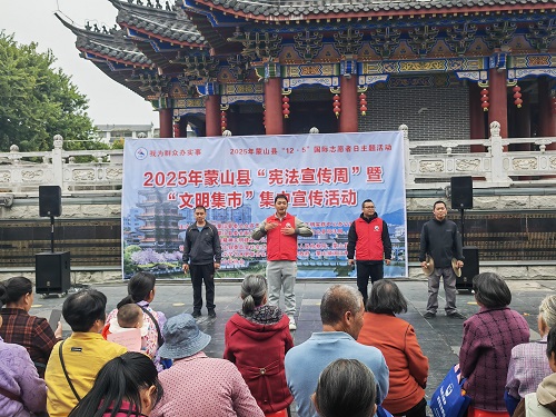 “全会精神人人夸,福润百姓万千家,围绕民生补短板,城乡融合喜开花……”一阵阵悠扬清脆的歌声,回荡在湄江河畔。2025年12月5日,由县委宣传部、县委依法治县办、县司法局、县文明办主办的“宪法宣传周”暨“文明集市”集中宣传活动在蒙山县长寿阁广场举行。活动以“学习宣传贯彻习近平法治思想 推动宪法深入人心”为主题,通过接地气、聚人气、有生气的节目表演和宣传,让宪法精神和习近平法治思想落地生根、深入民心。