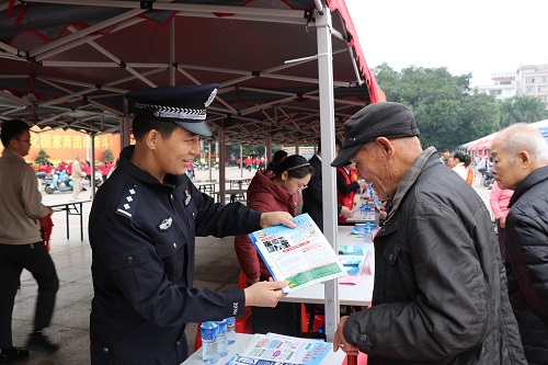 很快,宣传台前便聚拢了不少群众。民警辅警们结合身边案例,用本地话亲切地讲解起来:“阿叔阿姨,来了解下怎么守好我们的‘钱袋子’。”民警从宪法讲起,自然衔接到防范电信诈骗、警惕非法集资等实用法律知识。民警还通过展板向市民介绍在公共场所如何识别可疑情况、遇到突发状况如何保护自己和他人。“维护安全,人人有责。多一份警惕,城市就多一份平安。”