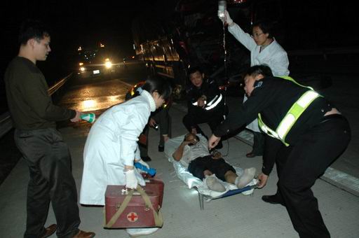 当天晚上23时许,在南宁至梧州高速公路岑溪市路段一上坡处,一辆挂贵州籍车牌的大货车与前面一辆货车发生激烈碰撞,导致后面的货车驾驶室严重变形,车上的人员被牢牢卡在驾驶室里动弹不了,情况十分危急。正在值班的岑溪市交警接到指令后,交警副大队长高伟国马上带领民警第一时间赶到事故现场,拉起警戒线,并和随后赶来的消防官兵和医务人员一起抢救伤员。经过约40分钟的努力,受伤人员被及时救出,急送医院救治。