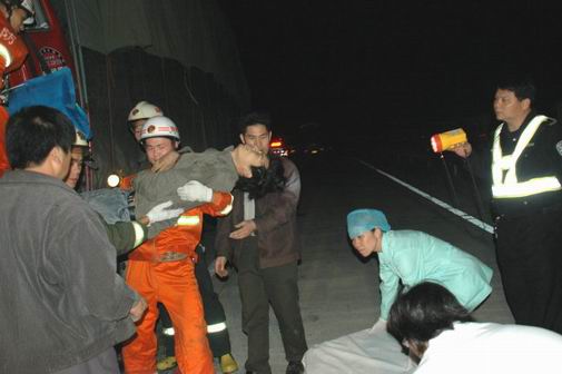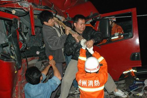 3月27日清晨约4时,一辆从苍梧开往玉林方向的容县籍大货车,在苍岑高速公路1公里路段,尾追撞上一辆同方向行驶的玉林籍大拖车尾部,驾驶室严重变形,睡在上卧铺的副驾驶员被夹在驾驶室内,内脏严重受伤,如不及时将其救出,将危及生命。岑溪交警、消防、120急救中心接报后及时赶到展开施救,在现场停车等候通行的驾驶员们也积极、主动地投入抢救的行列。他们用车辆牵引、扩张器、切割器及最原始的木棒撬压的方式全力施救,同时给伤员输液、输氧,以维持其生命。经过交警、消防、医护人员及现场驾驶员一个多小时同心协力的共同努力,终于将生命垂危的伤员救出,送往医院抢救。