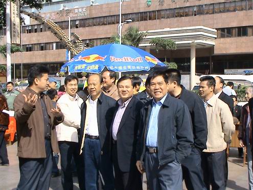 图为市委常委、政法委书记朱育兆(前右二),市人大副主任李奕权(前右三)、市政协副主席吴震(前右一)等领导到综治宣传启动仪式点之一的万秀区指导和慰问