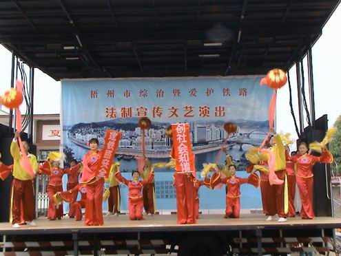 图为梧州市普法艺术团在蝶山区夏郢镇开展爱护铁路法制文艺演出现场