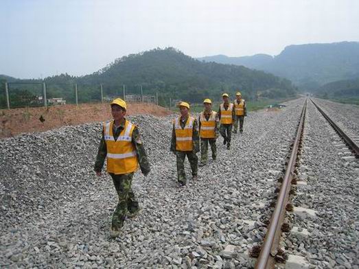 图为该县梨埠镇义务护路员在铁路边上巡查,检查安全隐患