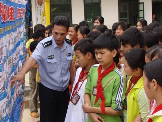 图为南宁铁路公安处石桥火车站派出所干警在苍梧县沙头镇铁塘小学宣传铁路交通安全知识
