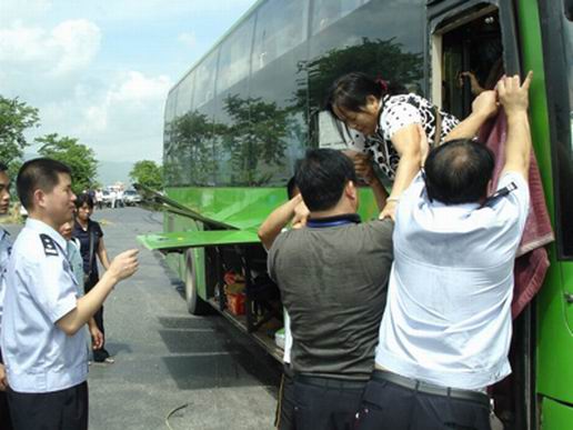 肇事大客车停在路边,由于当时还有39人被困在客车上出不来,加上烈日暴晒,客车里面的空气和环境可想而知!