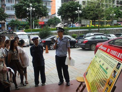 图为蝶山公安分局干警在宝石城开展打拐宣传