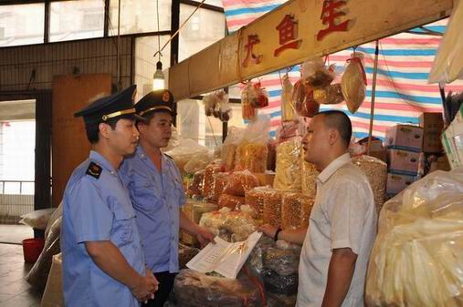 图为工商执法人员加强节日期间食品市场监管
