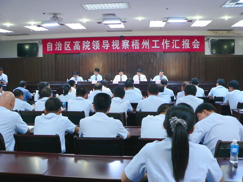 卢院长在汇报工作时指出,今年以来,梧州市法院坚持正确的工作指导思想,以自治区党委政府“一个决定,四个配套文件”为工作纲领,按照自治区高院提出的17项指标,努力加强法院工作,争取一、二年内成为全区模范法院,进入全国先进行列。上半年,全市法院狠抓群众申诉信访率、群众投诉率、上诉改判率等三项重点指标,审判质量和效率有较大提高,法院公正司法形象进一步提高。全市法院围绕中心大局,以加强队伍建设为根本,积极推进各项工作。全市法院加强队伍建设的主要措施是:第一,大力加强学习型机关、学习型党组织、学习型领导班子建设,认真落实党组中心组理论学习、党支部学习制度,积极开展“创先争优”活动,干警思想始终与市委保持高度一致,司法作风进一步改进。第二,积极创新法院管理机制,提高科学管理水平。全市法院抓党建促队建,通过建立健全党员绩效评估、领导干部绩效评估等制度,充分发挥党员的先锋模范作用,提高了党员、干部的工作积极性和责任感;两级法院坚持案件质量评查、讲评制度,定期举行优秀案件报告会,提高了司法能力,进一步统一了司法标准;全市法院设立“党员先锋岗”,坚持对各项工作情况进行定期通报,提高了干警的工作主动性、荣誉感和自我管理能力。第三,坚持以人为本,支持和鼓励干警学理论,办铁案,并完善食堂建设,为干警提供工作茶点服务,积极筹备第二届法院文化周活动,营造良好的法院工作氛围。卢院长表示,下半年,全市法院将按照区高院的统一部署和市委市政府的中心工作需要,狠抓17项争创工作指标,争取实现“争创全区模范、进入全国先进”活动目标。汇报时,卢院长还向自治区高院提出了6项具体的工作建议。