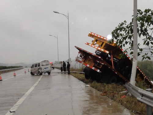 月18日中午十二点左右,岑溪市公安局交通管理大队特勤中队接到事故报警电话,辖区岑梧高速公路中林路段一辆粤X号牌的长安小汽车在行驶中突然发生故障撞向护栏,现车辆无法启动就在路中间,情况危险。特勤中队迅速组织民警赶往现场处理,在途中又接到另一报警电话:一辆桂K 号牌大型拖头车在同一地点翻下路边,撞毁大片路产。赶到现场时民警发现,两辆车之间前后距离不到五十米!经调查得知,桂K号车发现粤X号车停在路中间无法及时停车或者改道而冲出路边,所幸两车未造成人员伤亡。交警部门提醒广大驾驶员,近期雨天路滑,高速公路上行车特别要注意控制速度和开启灯光。